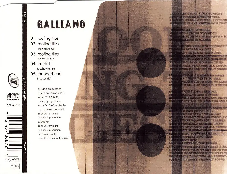 CD Single Galliano - Roofing Tiles, état CD M- Hülle M; Fabriqué en Allemagne 1996 Talkin Loud 578 687-2, Tracks Rooking Tile 3:48, [Jazz Odyssey] 3:41,[Instr. 3:47, Freefall [Peshay RMX] 7:43, Thunderhead [House Trip] 5:22