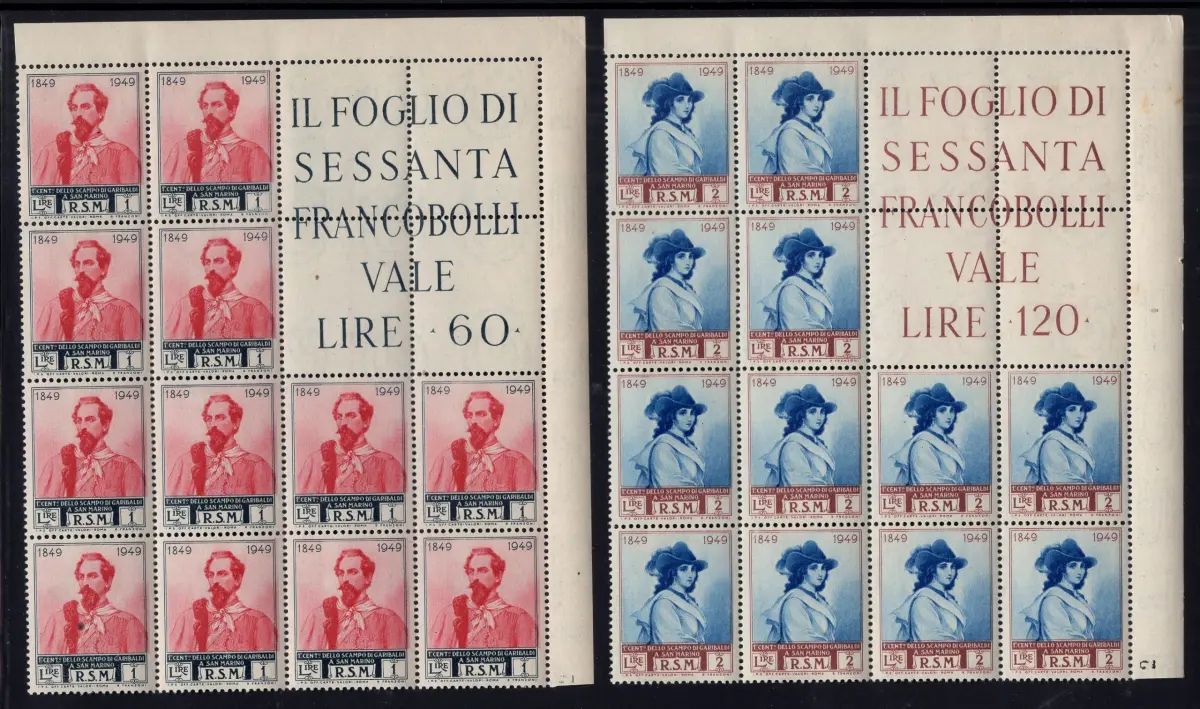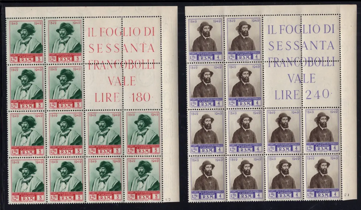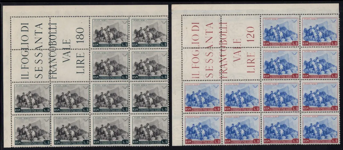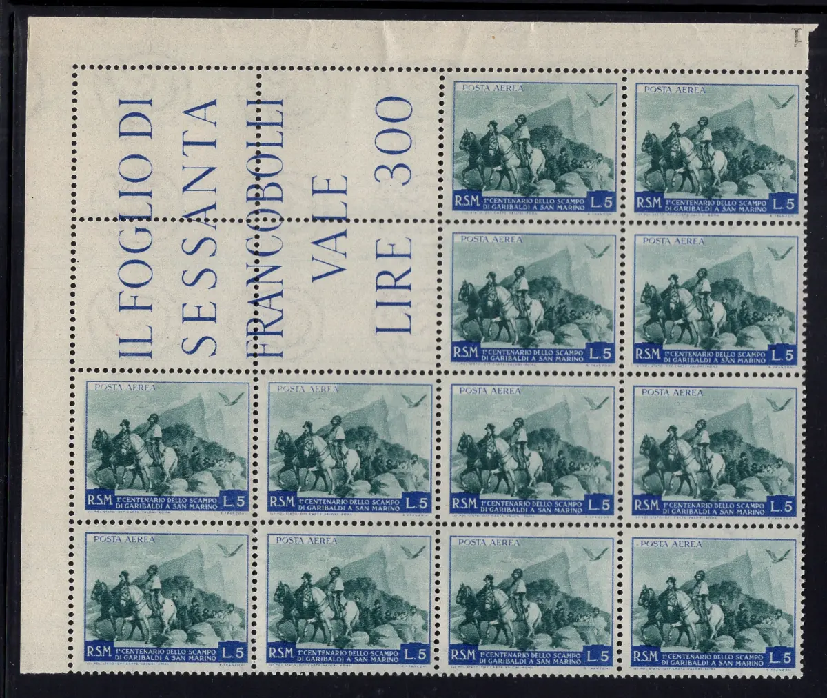 postfrisch ** - Garibaldi 1949 Nr. 358/361 + Luftpost Nr. 77/79 die Siebenwertserie im Block von 12 Exemplaren alle inklusive Eckblock mit Bogenbeschriftungen - Seltenes Set in sehr gutem Erhaltungszustand - Eckblockkatalog Nr. 13/16 + PA 1/3 Euro 400 - Nicht auffindbar, um die Sammlung zu spezialisieren Cod. 987/17