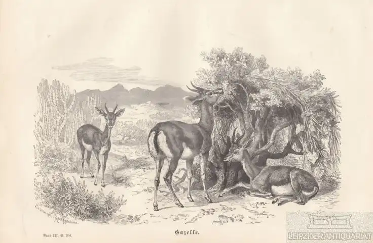 Bemerkungen: Zustand: Blatt leicht fleckig und altersbedingt minimal gebräunt an den Rändern // Kunstgrafik. Brehms Thierleben. Dritter Band. Große Ausgabe. Erste Abtheilung - Säugethiere. Dritter Band. Ansicht: 11,5 x 20 cm