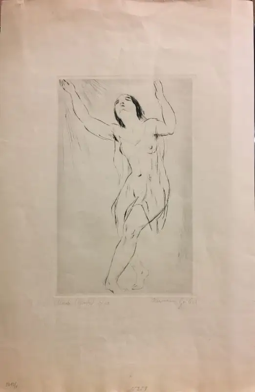 Signiert "Hermann Geibel", nummeriert 7/50 und bezeichnet "Alceste (Gluck)". Druck auf chamoisfarbenem leichten Karton. 27 x 17 cm. Papier: 48 x 31,5 cm