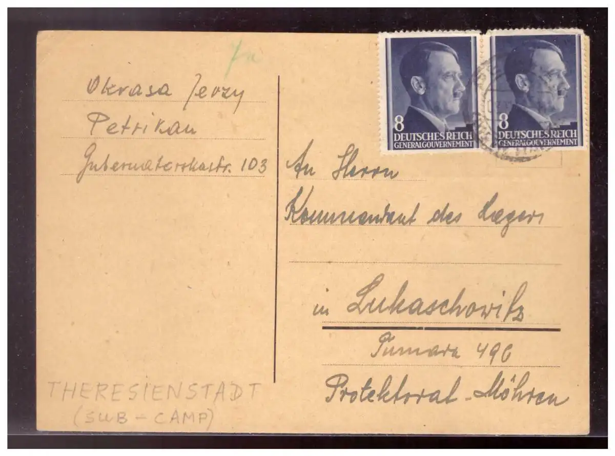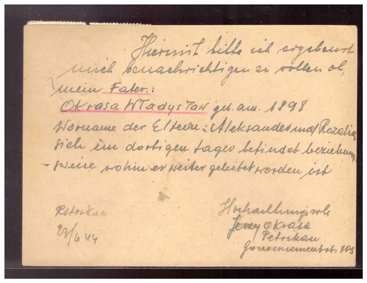 GG (021813) Judeika Postkarte gelaufen an Kommandant Lager Lukaschowitz, mit Bitte um Antwort über verbleib des Vaters