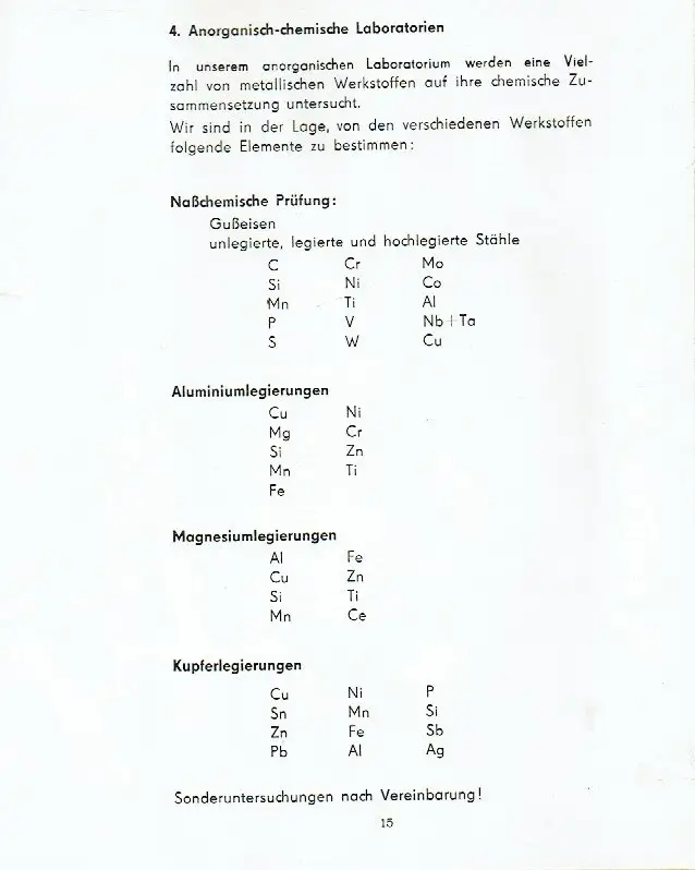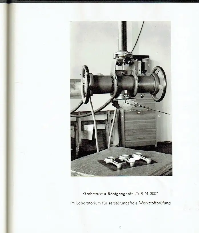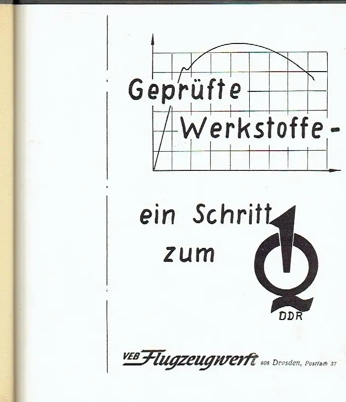 guter bis sehr guter Zustand, geringe Gebrauchs- und Alterungsspuren: Vorsätze gebräunt - Seiten sauber und ordentlich, da die Fotos aufgeklebt wurden, sind die Seiten aber teils wellig, Q steht für Qualität, war in der DDR ein zugelassenes, allgemein gültiges Symbol "Bedingt durch die bei der Reparatur von Flugzeugen sich ergebenden Aufgaben und gesetzlich geforderten Prüfungen, verfügt der VEB Flugzeugwerft über ein modern eingerichtetes Laboratorium. Mit den vorhandenen Einrichtungen und Apparaturen sind wir in der Lage, auch für andere Betriebe Untersuchungen durchzuführen. Auch Ihnen können wir helfen, indem wir Ihre Werkstoffe überprüfen. Sie erfüllen mit dem Einsatz von geprüften Werkstoffen eine gesetzliche Forderung des DAMW und tun damit einen Schritt zum Q. Weitere ökonomische Vorteile ergeben sich dadurch, daß eine ganze Anzahl verdeckter Mängel nicht erst im Produktionsprozeß bemerkt werden, sondern eben bereits bei der von uns für Sie durchgeführten Prüfung. Eine Anzahl von Betrieben, die über kein eigenes Labor verfügen, haben diesen Vorteil erkannt und uns mit Prüfaufträgen betraut. An der Aufgabenstellung konnten wir jedoch oftmals ersehen, daß man die bei uns vorhandenen Prüfmöglichkeiten nicht kannte und demzufolge auch nicht nutzte. Mit dieser Broschüre möchten wir Sie deshalb informieren, welche Aufgaben wir von Ihnen übernehmen können. Sollten in speziellen Fällen die von uns gemachten Angaben nicht ausreichen, dann stehen Ihnen unsere Fachingenieure für jede Auskunft zur Verfügung.", Leinen, ca. 19 x 21, 23 Seiten mit 8 montierten (aufgeklebten) Fotos