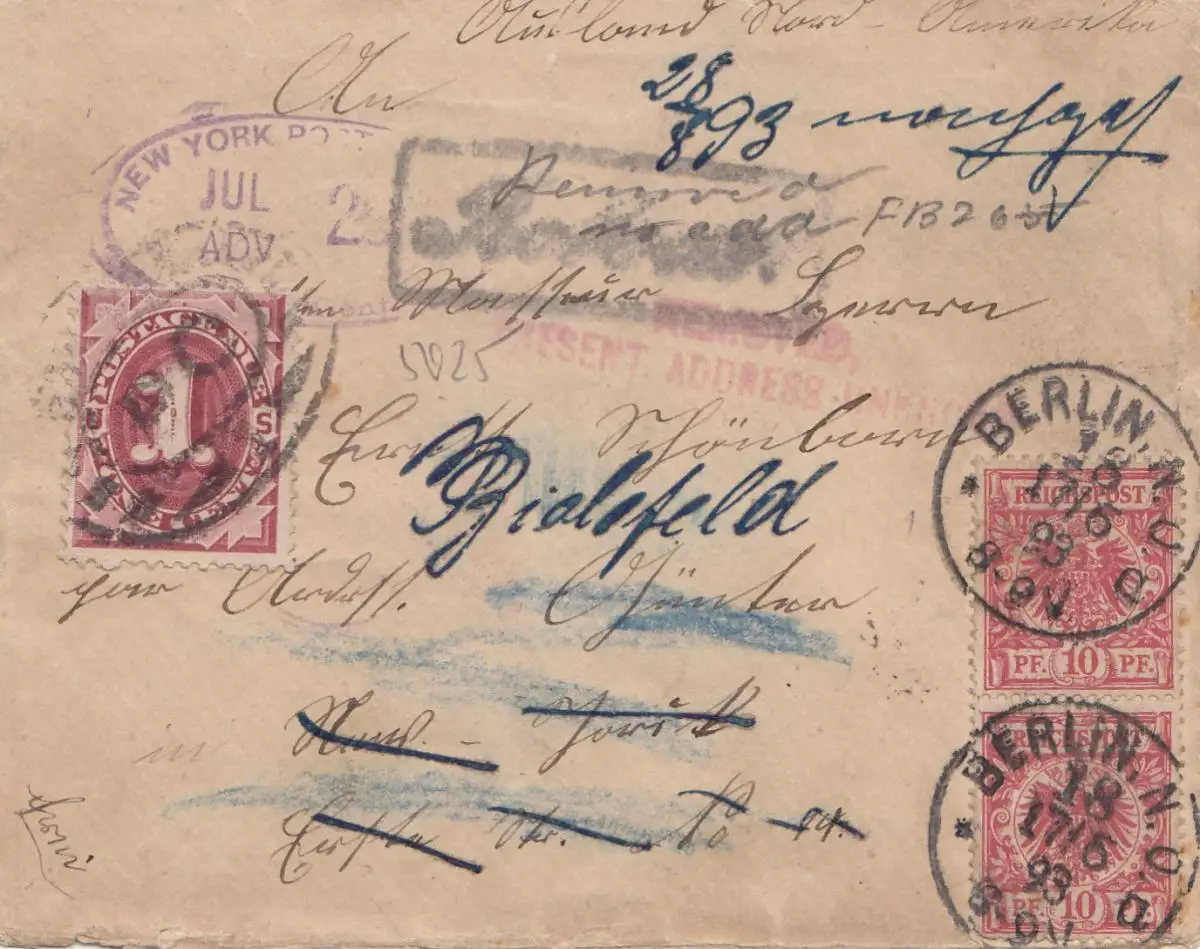 Germany Berlin, 1893 to New York, Tax, forwarded and back to Germany/Bielefeld