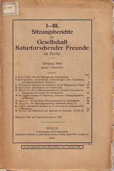 Titel: Sitzungsberichte I - III der Gesellschaft Naturforschender Freunde zu Berlin. Jahrgang 1942. Januar - Dezember. Im Inhalt Berichte von W. Eichler, J. Hirschler, F. Klinghardt, H. Melchior, H, Pohle, W. Ramme, W. Seitz, G. Tembrock, M. Weise und H. Wundsch