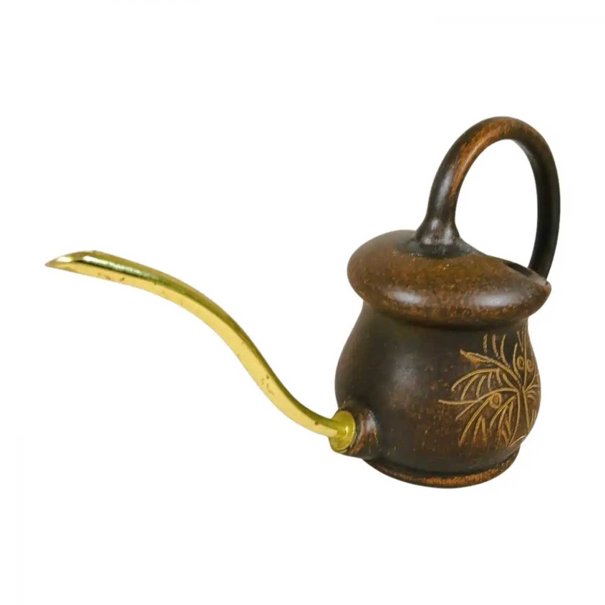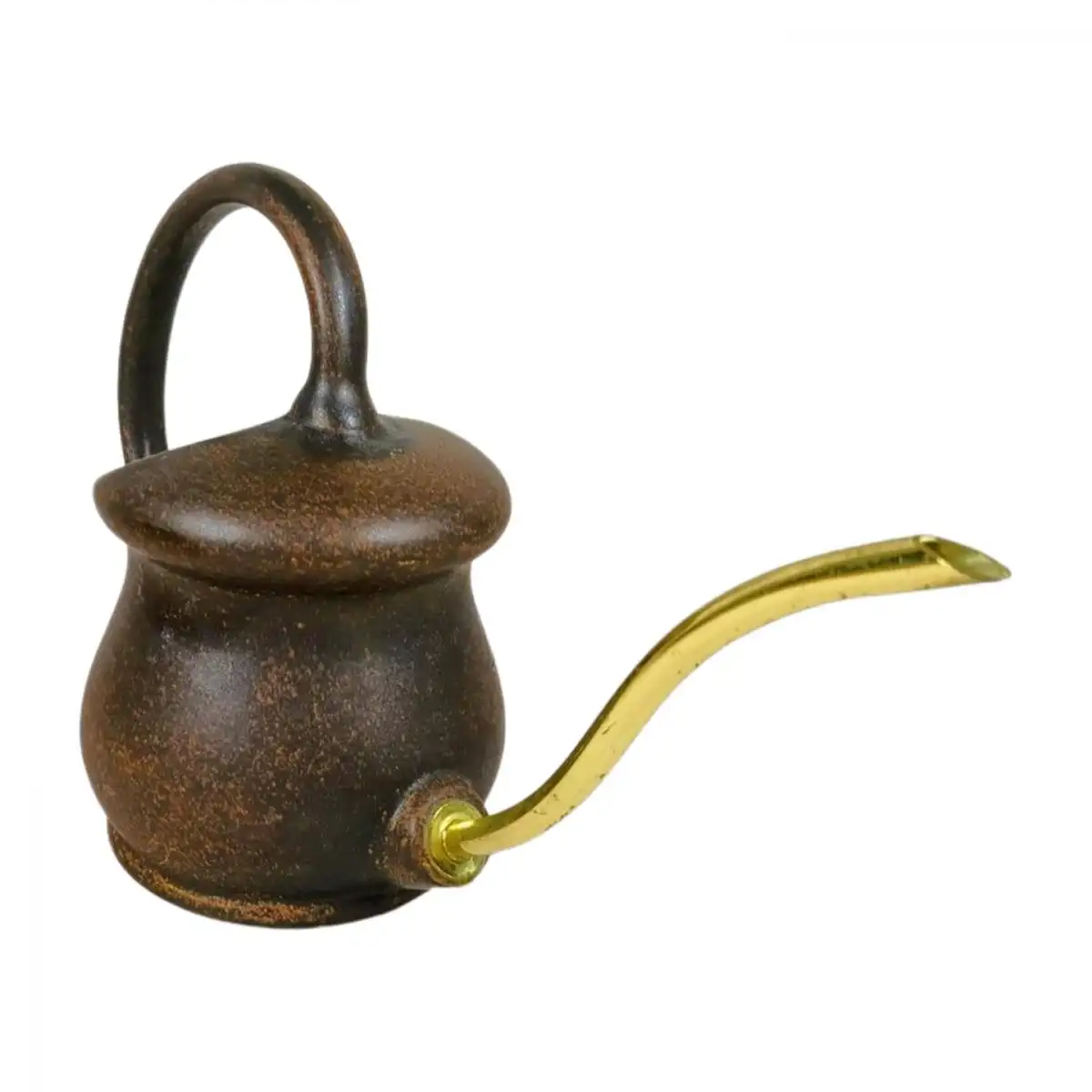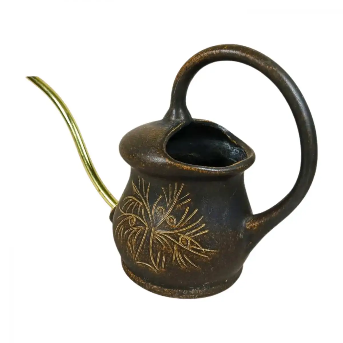 Keramik-Gießkanne aus der Mitte des 20. Jahrhunderts mit Messingausguss, vereint rustikale Eleganz mit dekorativem Design. Sehr guter Zustand mit einigen mineralischen Ablagerungen im Inneren durch Gebrauch. Funktional für die Pflanzenpflege und ideal als dekorativer Akzent für Haus oder Garten.