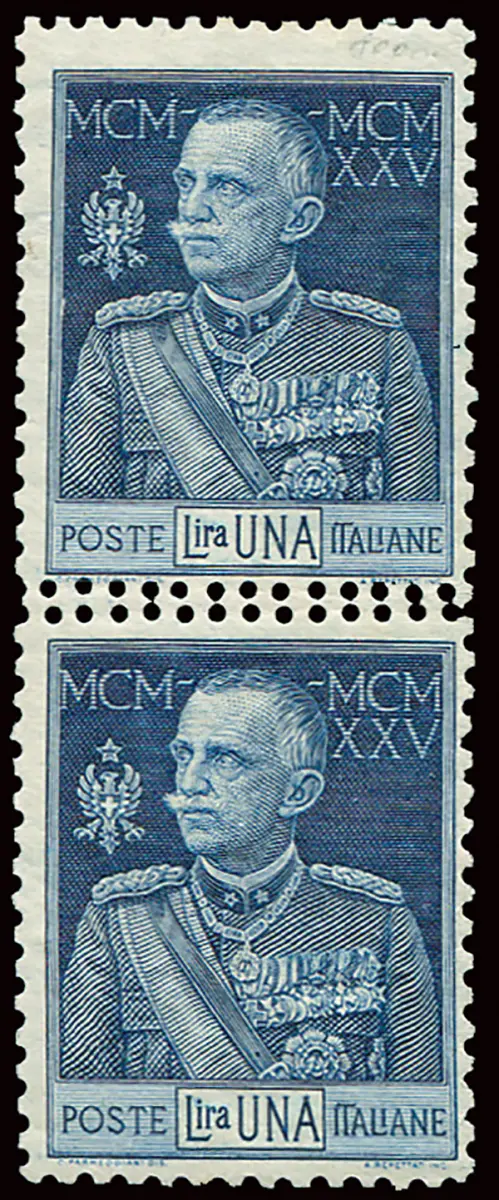 MH Linguellato - Giubileo Lire 1 Nr. 187pba vertikales Paar mit Doppelverzahnung in der Mitte - Selten, auch mit filigranen Buchstaben 5/10 - leichte Linguella-Spur - Kat. euro 500 Cod. 151/15