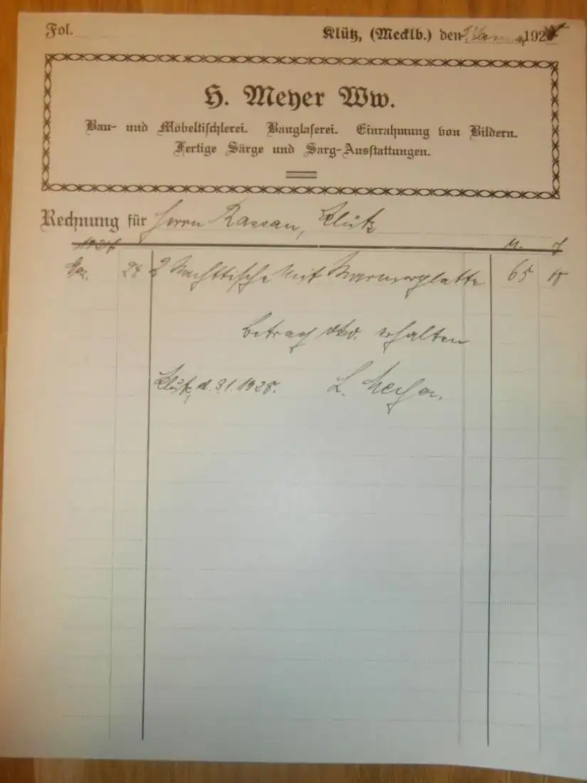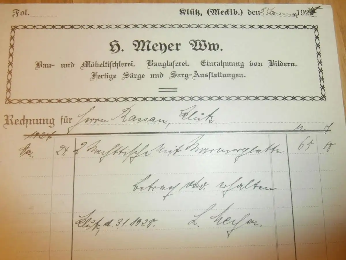 Glaserei - H. Meyer in Klütz , 1928 , alte Rechnung , Mecklenburg !!