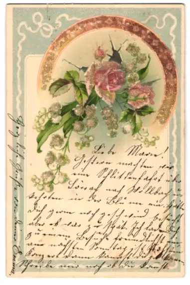 Glitzer-Perl-AK Rosenblüten und weisse Knospen an einem Zweig