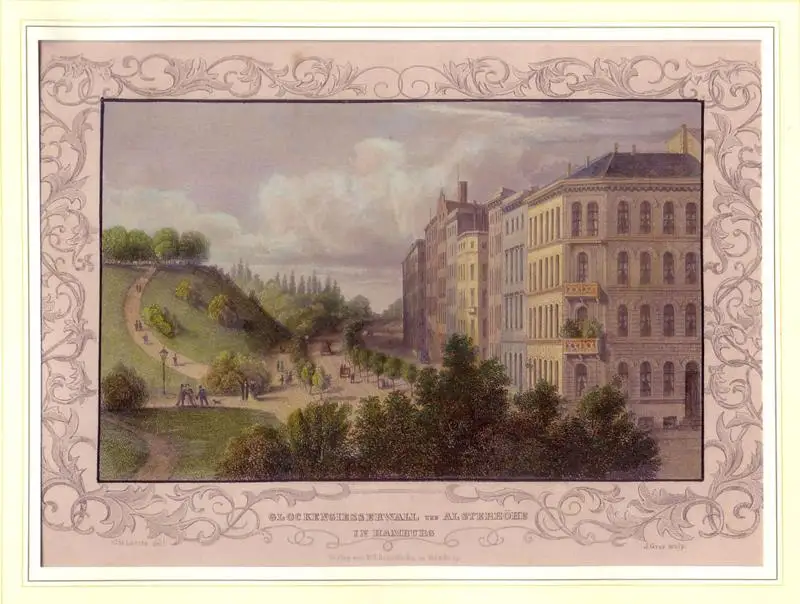 Der Betrachter blickt von der Lombardsbrücke auf die Ecke Alsterdamm/Glockengießerwall in Richtung Süden u. hat links die Erhebung vor sich, auf der heute die Kunsthalle steht. - James [auch: Jens] Gray, (geb. 1813), britischer Graphiker, Maler und Zeichner, wirkte 1842-1868 in Hamburg (Der Neue Rump, S. 150). - Carl Martin Laeisz (1803-1864), Hamburger Maler u. Lithograph (ebda., S. 252). - Etwas angestaubt