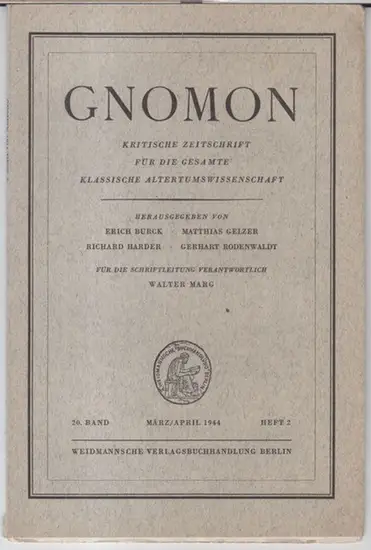 Titel: Gnomon. März / April 1944 - 20. Band, Heft 2. Mit: Bibliographische Beilage Nr. 1. - Kritische Zeitschrift für die gesamte klassische Altertumswissenschaft. - Enthalten sind Buchbesprechungen, u. a.: K. Schefold über Akurgal - Griechische Reliefs des 6. Jahrhunderts aus Lykien / G. Lippold über Züchner - Griechische Klappspiegel / R. Camerer über Riemschneider - Held und Staat in Euripides' Phoenissen