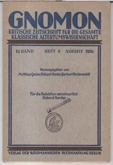 Gnomon. - Herausgeber: Matthias Gelzer / Richard Harder / Gerhart Rodenwaldt. - Besprechungen: F. Matz über Franz Messerschmidt / E. Linkomies über J. Altheim / P. L. Strack über Clemens Bosch etc: Gnomon. August 1936 - 12. Band, Heft 8. Mit: Bibliographi
