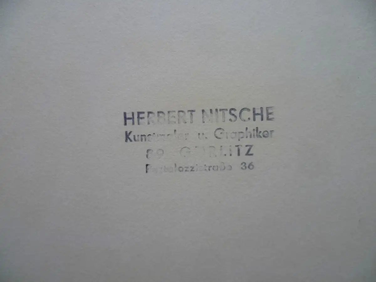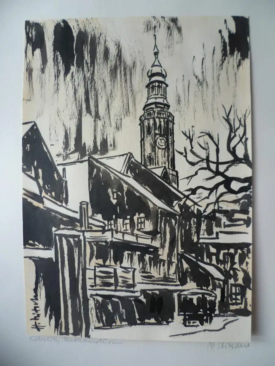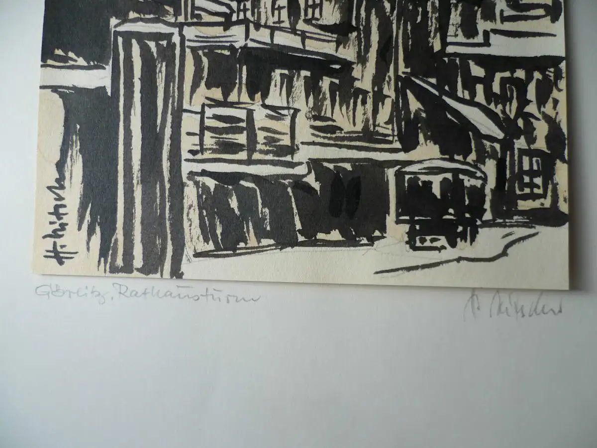 Originale Tuschezeichnung des bekannten Malerts und Grafikers Herbert Nitsche (hat u.a mehrere Bücher illustriert, z.B. "Der Türmer erzählt"). Auf Trägerkarton montiert, vom Künstler mit Bleistift bezeichnet "Görlitz, Rathausturm" und signiert, auf der Rückseite Stempel des Künstlers. Bildgröße 29,5x20,5cm, Gesamtgröße 43x31cm. Sehr gut erhalten.