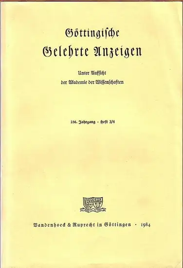 Titel: Göttingische Gelehrte Anzeigen. Jahrgang 236, 1984, Heft 3/4. Im Inhalt u. a. : Wolfgang Blümel über Alfred Heubeck und Günter Neumann - Res mycenaeae. Akten des VII. Internat. Mykenolog. Colloquiums in Nürnberg April 1981 / Claude Brixhe über Terence B. Mitford und Oliver Masson: The syllabic inscriptions of Rantidi - Paphos / Martin Kreeb über A. Papageorgiou-Venetas, Delos / Alexander Sideras über Christos Theodoridis / Udo W. Scholz über Christoph Ulf - Das römische Lupercalienfest / Klaus Fittschen über Jale Inan und Elisabeth Alföldi - Rosenbaum: Römische und frühbizantinische Porträtplastik aus der Türkein / Helmut Feld über A. Damasus Trapp / Xenja von Ertzdorff über Kurt Ruh - Höfische Eoik des deutschen Mittelalters. Erster Teil: Von den Anfängen bis zu Hartmann von der Aue