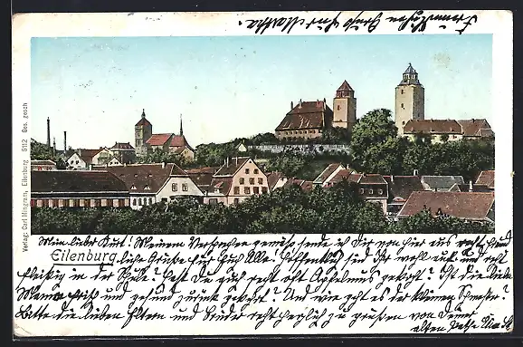 Goldfenster-AK Eilenburg, Teilansicht mit Kirche
