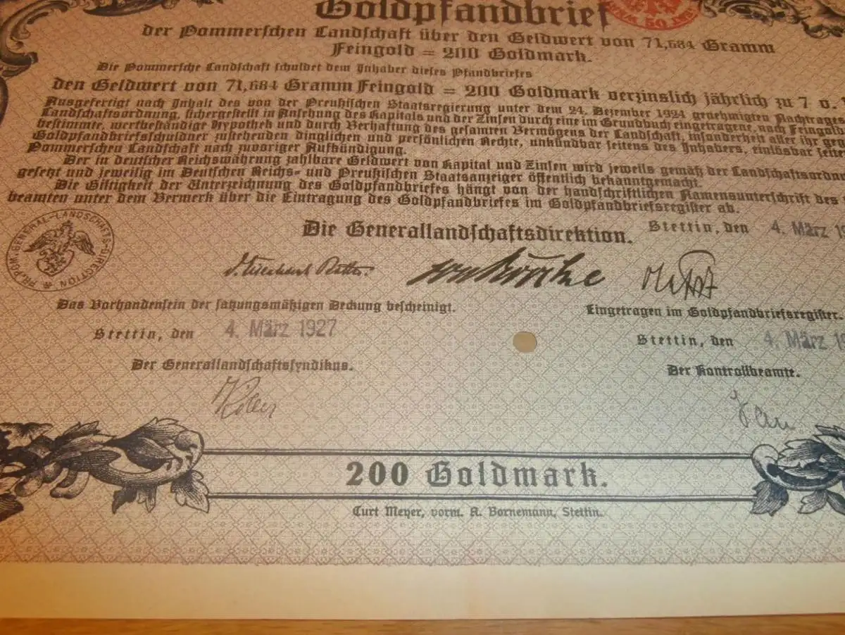 Goldpfandbrief Stettin / Pommern 1927 , 200 Goldmark , Gold !!