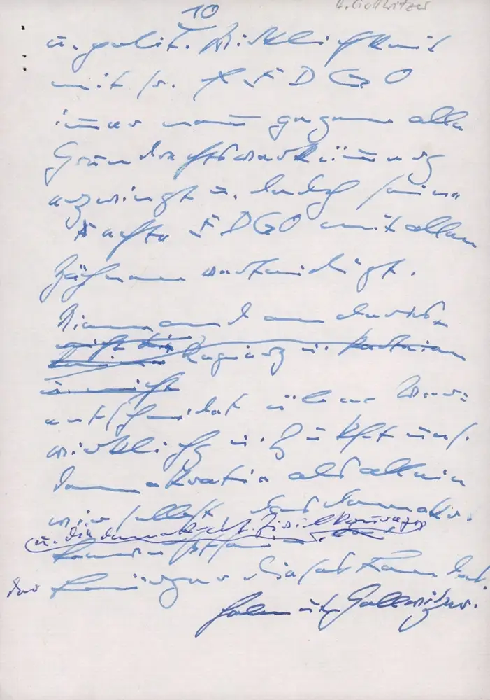 Gollwitzer, Helmut (1908-1993), ev. Theologe. - 10. und letztes Blatt mit Kladdenotizen zu einer Rede, in Tinte geschrieben und mit Kugelschreiber korrigiert und ergänzt. Überwiegend unleserlich bis auf die Unterschrift und die Begriffe "FDGO" (mehrfach), "polit. Wirklichkeit", "Zukunft": "Niemand anderes [einige Wörter durchgestrichen] entscheidet über Verwirklich[un]g u. Zukunft uns[erer] Demokratie als allein wir selbst, ..."
