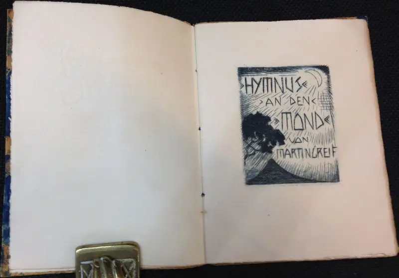 Greif, Martin: Hymnus an den Mond. [Band 11 der Miniatur-Kunstgaben]. 24 einseitig bedruckte radierte Blätter mit ill. Titelbblatt, 5 ganzseitigen Illustrationen und 6 Textseiten. Radiert und signert von Leopold Thieme.