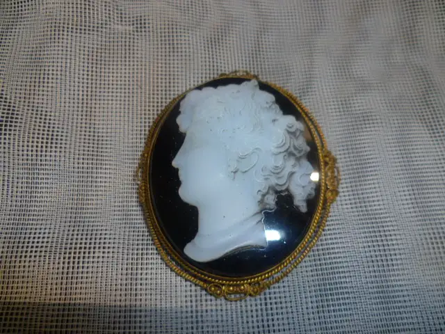 "Griechische Göttin " Große viktorianische Brosche - Gemme besetzt mit einem Onyx und einem geschnitztem Speckstein, Frankreich um 1870