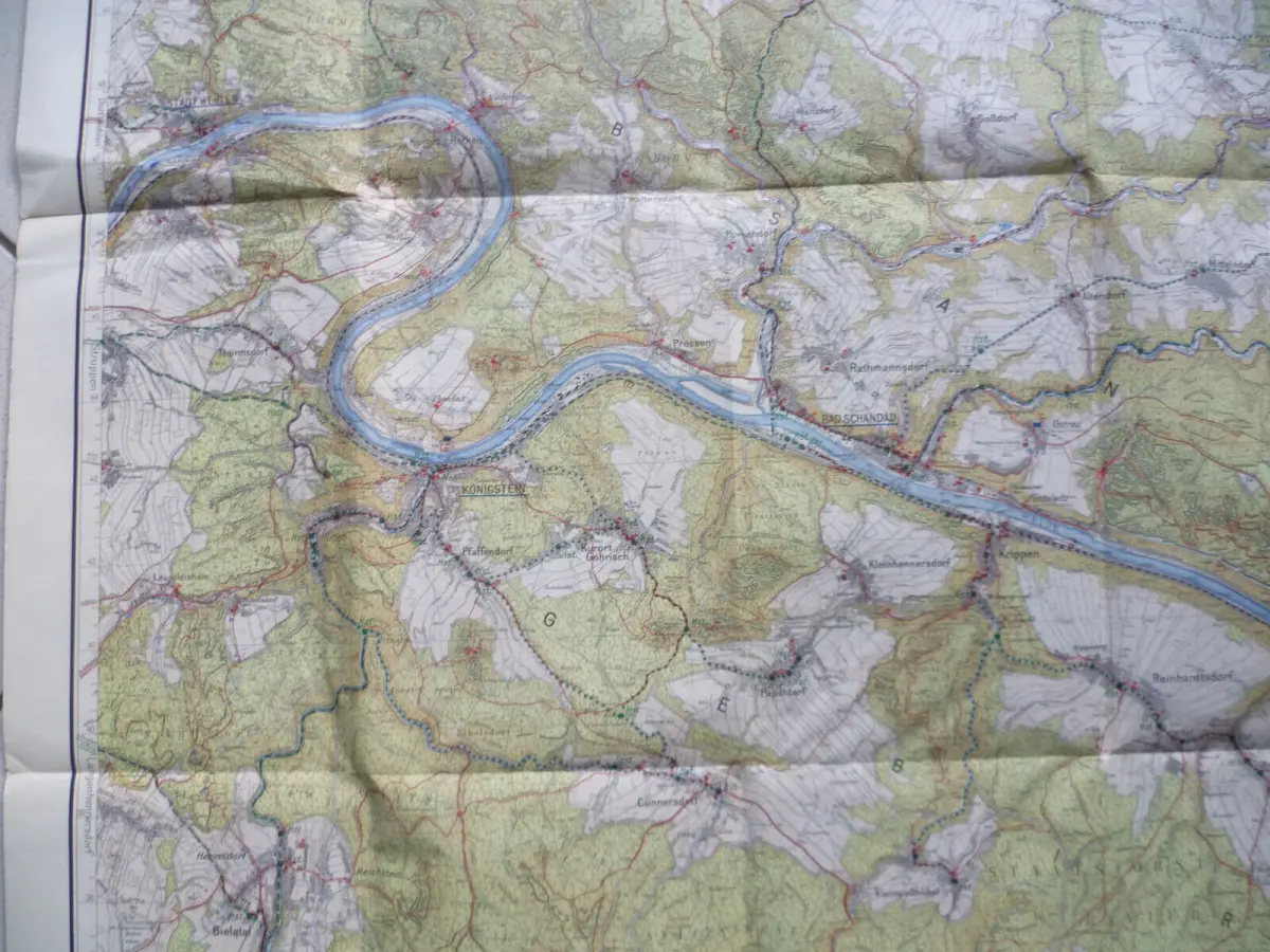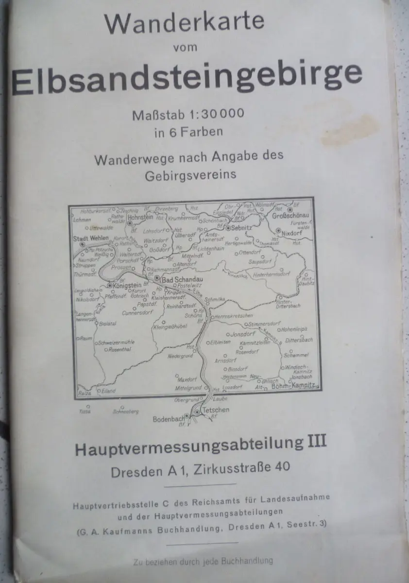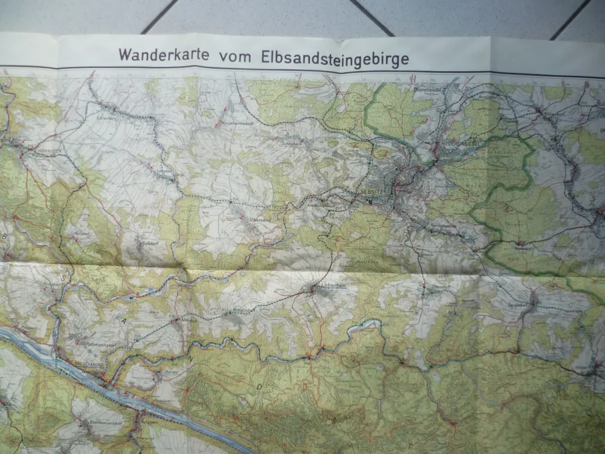 Wanderwege nach Angabe des Gebirgsvereins. Umfasst die Sächsische und Böhmische Schweiz. Im Auftrage des Sächs. Ministeriums für Wirtschaft und Arbeit herausgegeben von der Hauptvermessungsabteilung III, 1942. Gesamtgröße ca. 75x100cm, gefaltet auf 23x15cm. Gut erhalten.