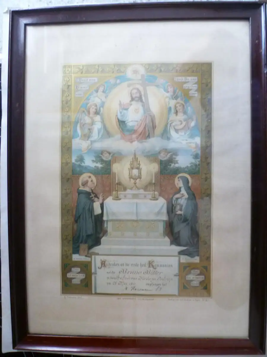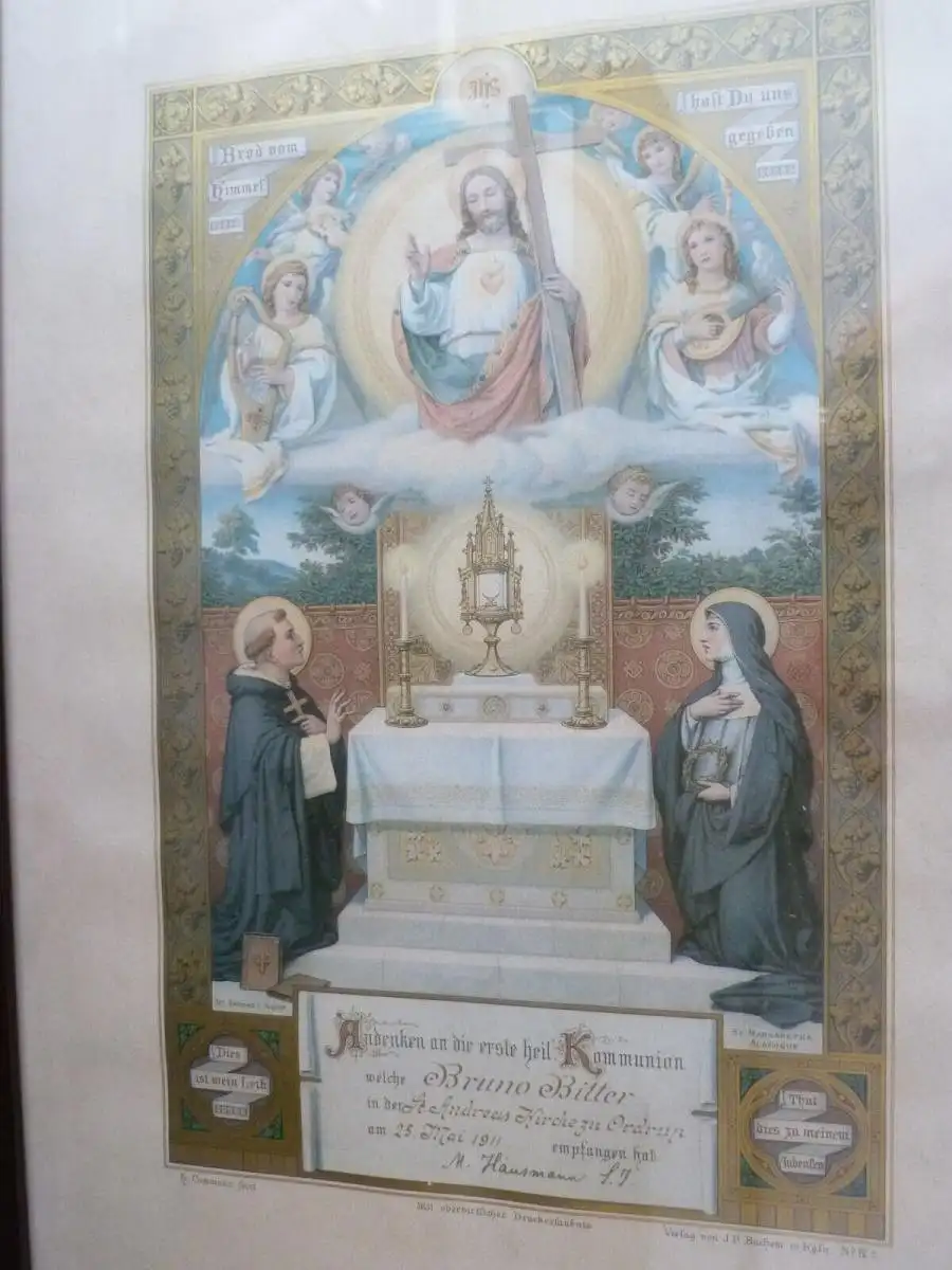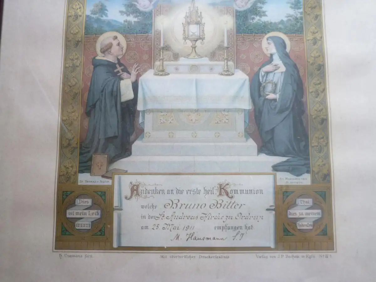 Seltenes Dokument für deutsches katholisches Leben in Dänemark: Andenken an die erste heil. Kommunion welche Bruno Bitter in der St. Andreas Kirche zu Ordrup am 25. Mai 1911 empfangen hat. Handschriftlich auf einer lithographierten Urkunde aus dem Verlag von J. J. Bachem in Köln. Gesamtgröße 48x36cm, gut erhalten.