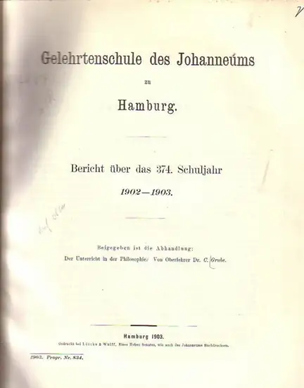 Titel: Der Unterricht in der Philosophie. Beilage zum Jahresbericht der Gelehrtenschule des Johanneums zu Hamburg. Schuljahr 374, 1902-1903. Programm Nr. 834. In zwei Teilen