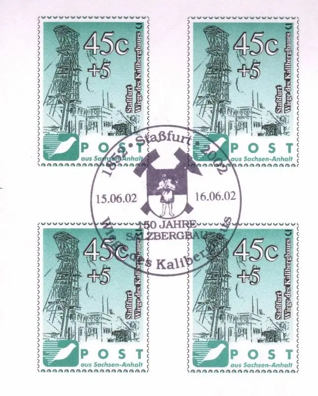 • MichSeite Grüne Post: MiNr. 4, 15.06.2002, "150 Jahre Kalibergbau in Staßfurt", Satz, Viererblock, Ersttagssonderstempel Beschreibung \nAusgabeland: Bundesrepublik Deutschland \nPostdienstleister: Grüne Post, Bernburg \nAusgabeanlass: Briefmarkenausgabe "150 Jahre Kalibergbau in Staßfurt" Katalognummer: MiNr. 4 Ausgabedatum: 15.06.2002 Nominale: Satz (1 Wert) zu 0,45 + 0,05 EUR (4 x) \nTyp: - \nErhaltung: selbstklebend, gerade gestanzt, Ersttagssonderstempel \nHinweis: Viererblock, breitrandig geschnitten