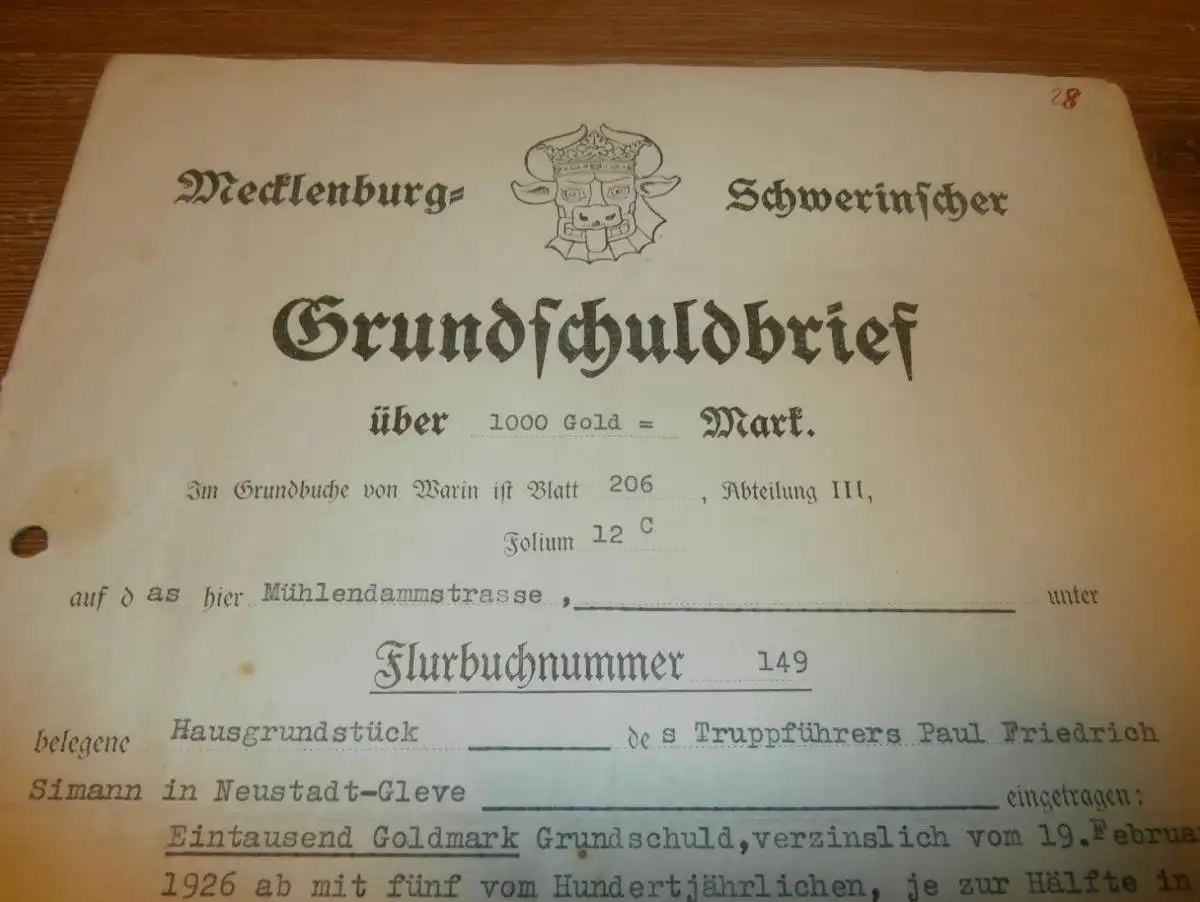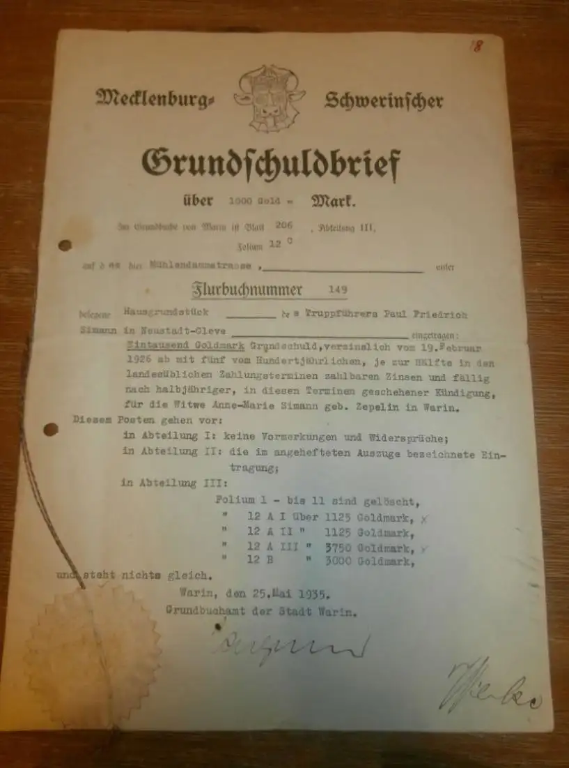 Grundschuldbrief , Neustadt-Glewe 1935 , Truppführer Paul Friedrich , Warin , Gold , Mecklenburg !