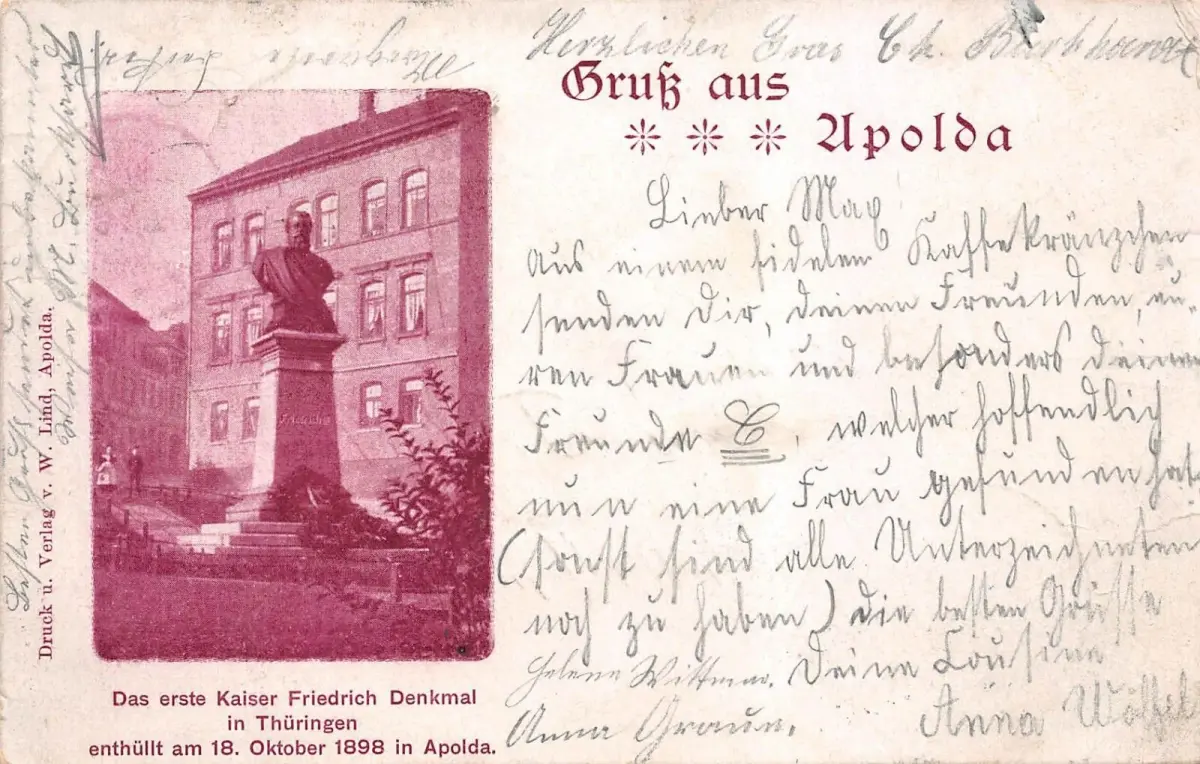 Gruß aus Apolda Das erste Kaiser Friedrich Denkmal Thüringen Postkarte AK 1899