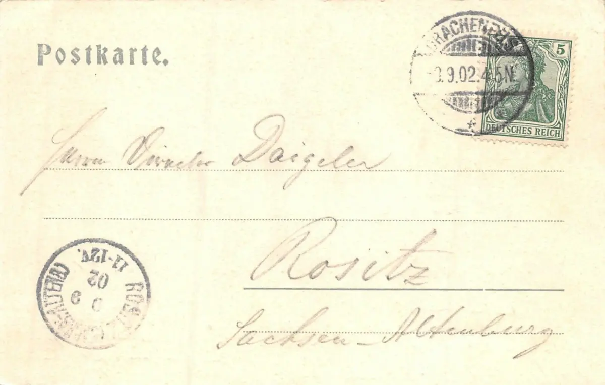 Rückseite: gelaufen 1902 von Drachenfels nach Rositz