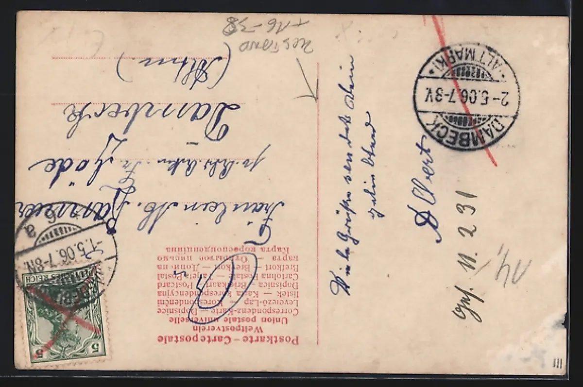 alte Ansichtskarte, gelaufen 1906, rückseitig Oberflächenschaden, Kanten bestoßen, guter Zustand