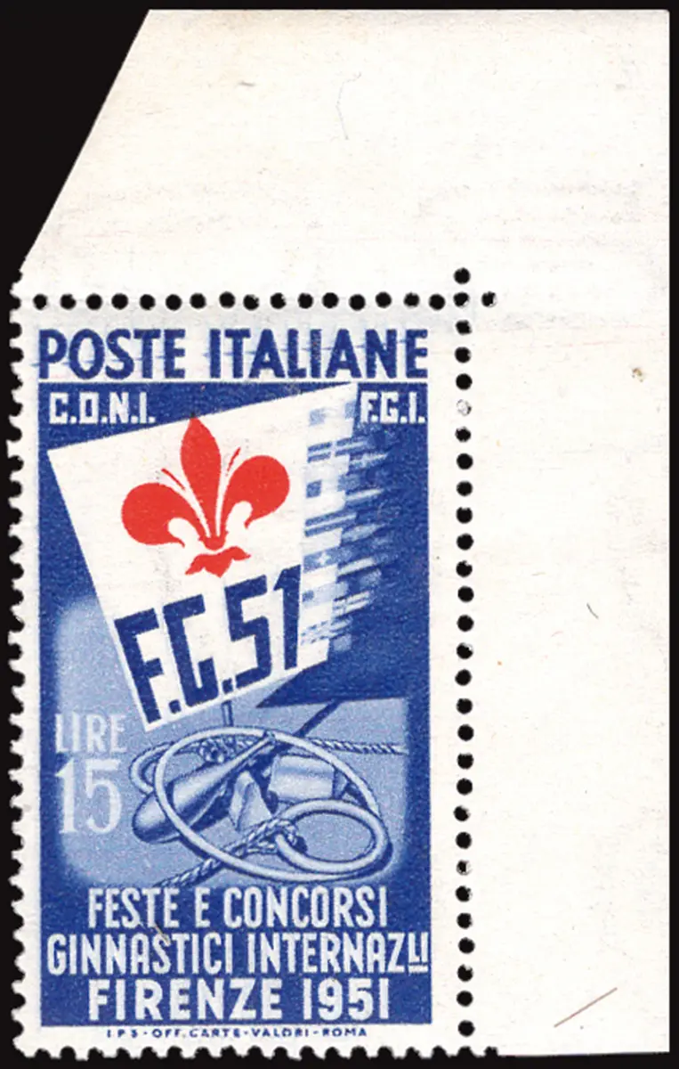 MNH - Vollgummi - - Ginnici Lire 15 Nr. 663 schönes Exemplar a. von f. mit schräger Farblinie, die sich durch den gesamten Schriftzug Poste Italiane zieht - kuriose gelegentliche Sorte Cod.601/182