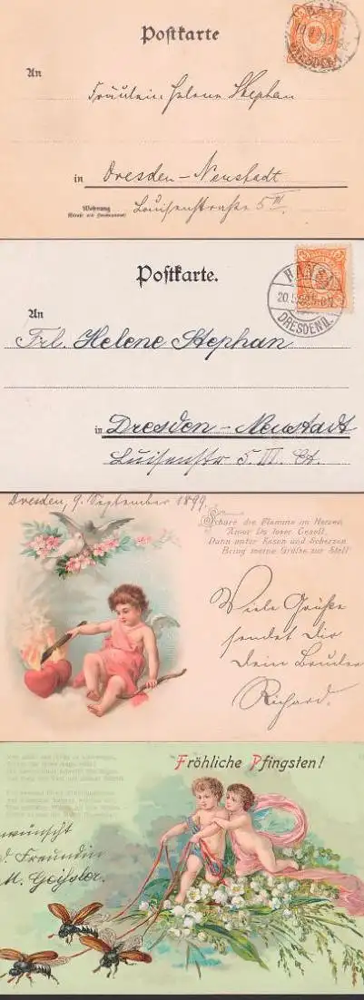 HANSA Dresden zwei Glückwunschkarten mit Privatpostmarken 3 Pfg. Pfingsten, Maikäfer, flammende Herzen