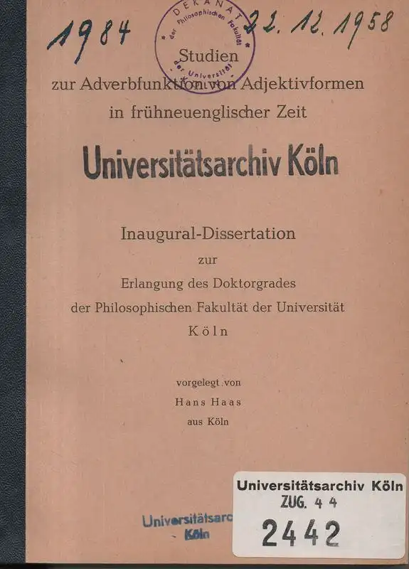 Haas, Hans: Studien zur Adverbfunktion von Adjektivformen in frühneuenglischer Zeit: <Die Stufen d. gradadverbiellen Funktion v. Adjektiven zur Modifizierg v. Adjektiven, untersucht an ausgew. Texten u. dargest. an ausgew. Beisp.>.
