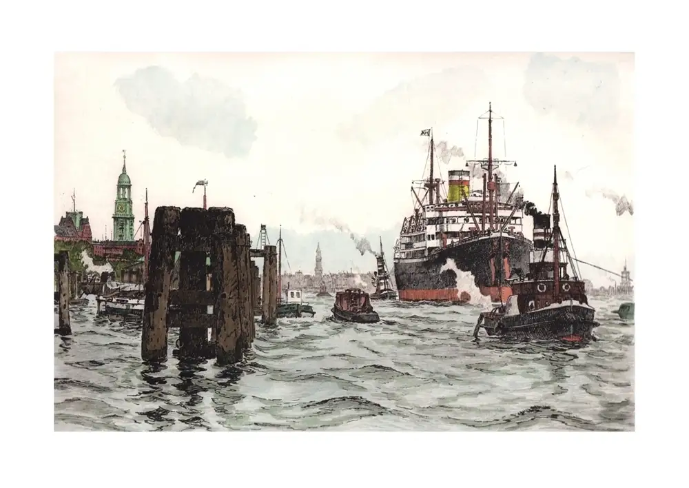 Wilhelm Adolf Julius Mühlhan (1886-1956), Hamburger Maler und Grafiker. - Von Schleppern gezogener Dampfer im Hamburger Hafen. Links große Duckdalben mit Michel im Hintergrund