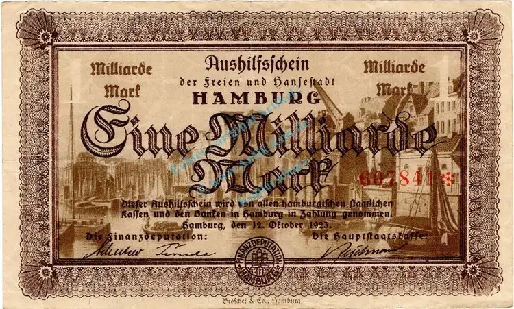 Hamburg , Banknote 1 Milliarde Mark Schein gbr. Keller 2109.o , Hamburg 1923 Inflation
