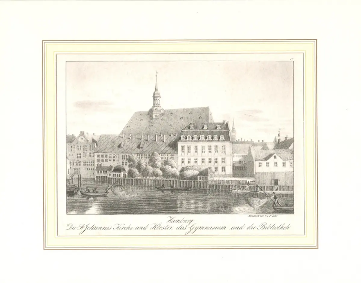 Hamburg. Die St. Johannis Kirche und Kloster, das Gymnasium und die Bibliothek. Original-Lithographie von Chr. und Peter Suhr