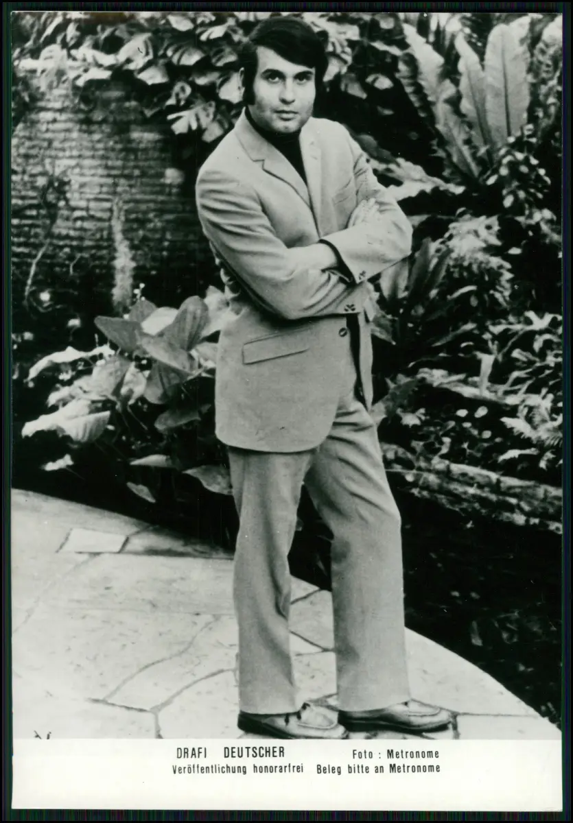 Hamburg – Originales Pressefoto des bekannten deutschen Sängers, Komponisten und Produzenten Drafi Deutscher, entstanden in den 1970er Jahren im Auftrag des Labels Metronome Records. Das Motiv zeigt den Künstler elegant gekleidet in klassischer Pose vor einer Gartenkulisse – typisch für Promotionaufnahmen jener Zeit.