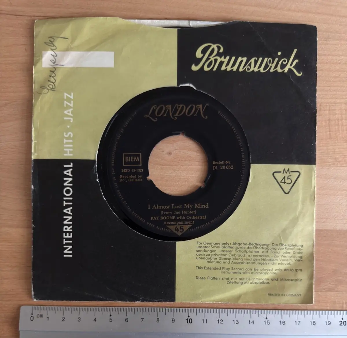 Hamburg Pat Boone Single 45rpm London DL20052 I Almost Lost My Mind Brunswick Künstler: Pat Boone Pat Boone war einer der bekanntesten US-amerikanischen Sänger der 1950er-Jahre und galt als musikalisches Bindeglied zwischen Pop und Rock’n’Roll. Seine Aufnahmen erschienen weltweit, unter anderem auf Dot Records und in Deutschland auf London Records / Brunswick. I Almost Lost My Mind war einer seiner größten Hits und trug wesentlich zu seinem internationalen Erfolg bei. Besonderheiten