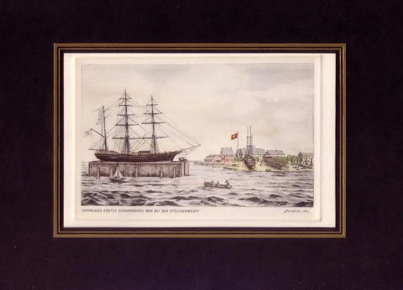 Die Werft H. C. [Heinrich Christopher] Stülcken Sohn wurde 1846 in Steinwerder gegründet; 1858 wurde ein hölzernes Schwimmdock, das erste in Hamburg, gebaut u. war bis 1911 in Betrieb. - Gutes Exemplar
