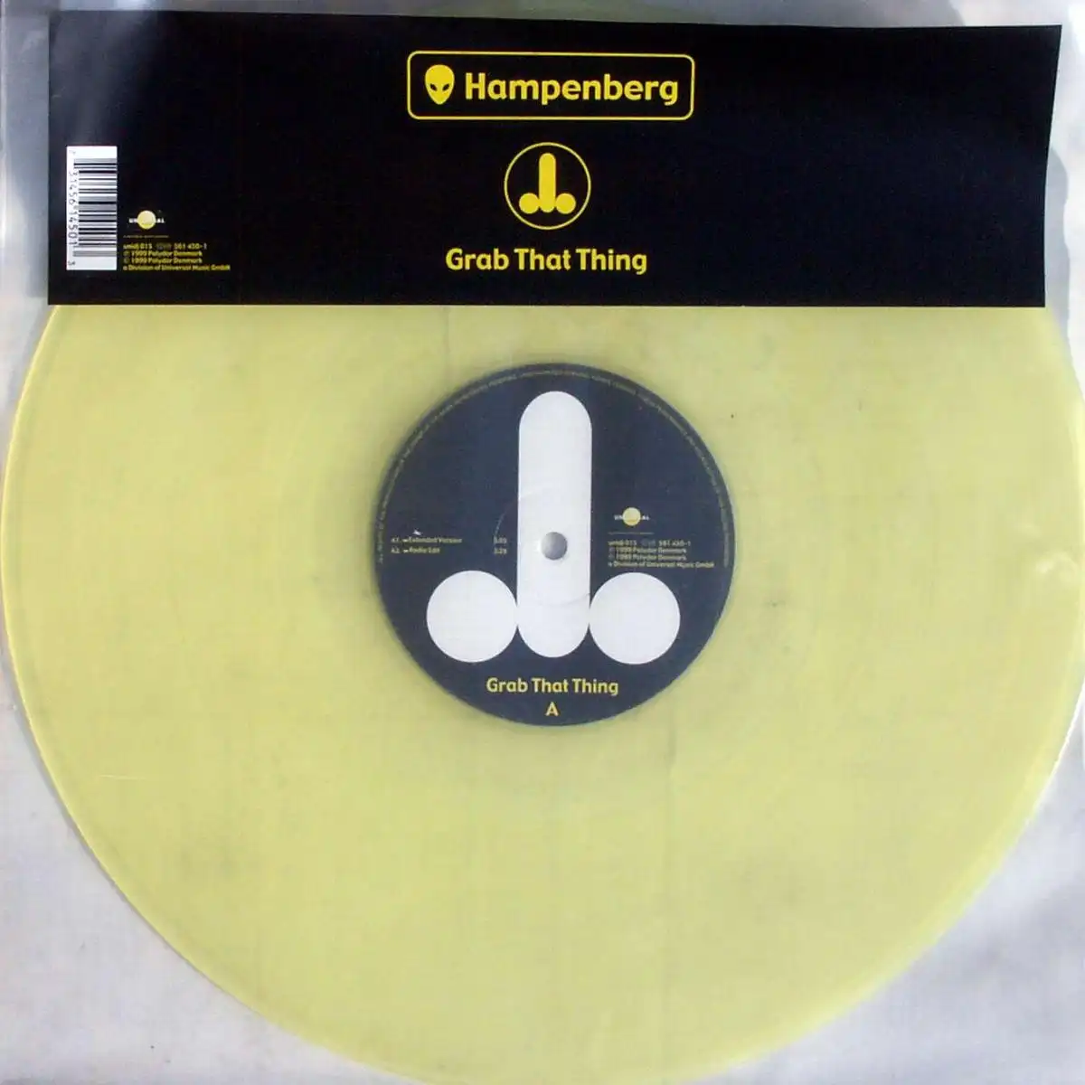 12" Maxi Hampenberg - Grab That Thing, yellow vinyle, couverture neutre avec autocollant Info, plaque M- enveloppe d'état M; 1999 Urban 561 450-1, Tracks Extended Version 5:05, Radio Edit 3:29, Pasta People Pop4Life Mix 6:07, pâtes Pères Dub4 Life Mix 5:27