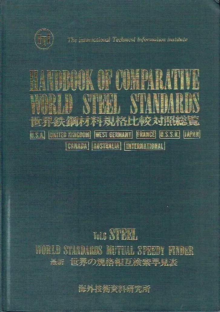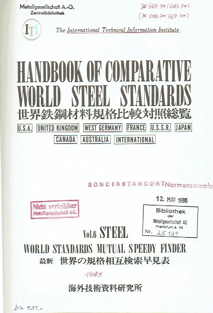 guter Zustand, Gebrauchs- und Alterungsspuren: ehemaliges Bibliotheksexemplar - Titel mit Stempeln und Notizen - Vorsatz mit weiteren Stempeln - Seiten aber sauber und ordentlich - 3 der Einbandecken etwas gestaucht und nach innen gebogen, dadurch auch einige Seiten teils etwas eselsohrig, Steel is not an exclusive commodity of any one country; it has no geographical boundaries. The steel standards of a country are generally established on a basis of chemical composition, physical properties, application etc., but not necessarily on a common universal basis. Often the conditions and needs of the country are reflected and incorporated therein. Thus, the standards even for the same grade of steel differ from one country to another. Such differences are a constant source of inconvenience, especially, to those who are engaged in foreign trade, dealing with steels, steel products and machine and plants that use all kinds and types of steel. It is not only inconvenient, but it is time-consuming to identify and compare the steel standards of one's own country with those of others for the same grade of steel or to compare their specifications, for example, chemical composition. Thus, there is a tendency to evade the practice of identification and comparison by those to whom time is particularly limited, although they realize the full importance and necessity of such a practice. Despite the worldwide recognition for the need of arranging the steel standards and specifications of major industrial countries of the world in a single volume in such a form as to allow ready identification and comparison, such an undertaking has not yet been attempted because of the extreme difficulties and pain-staking efforts involved. In response to the requests and needs of business and industry, The International Technical Information Institute (ITI) has organized a team of specialists to undertake such an undertaking. These specialists re-present many engineering and scientific and they are associated with a broad range of industrial and academic institutions. They have collected steel standards and specifications of the major countries and tabulated them by country, standards, and grade in a readily comparable form in a single volume. The result of their devotion to diligent and continued efforts is the Handbook of Comparative World Steel Standards. For convenience, the Handbook is prepared in English and Japanese and its first edition was published in 1974 and revised in 1980 and 1982, Leinen, ca. 18,5 x 26, 502 + XII Seiten