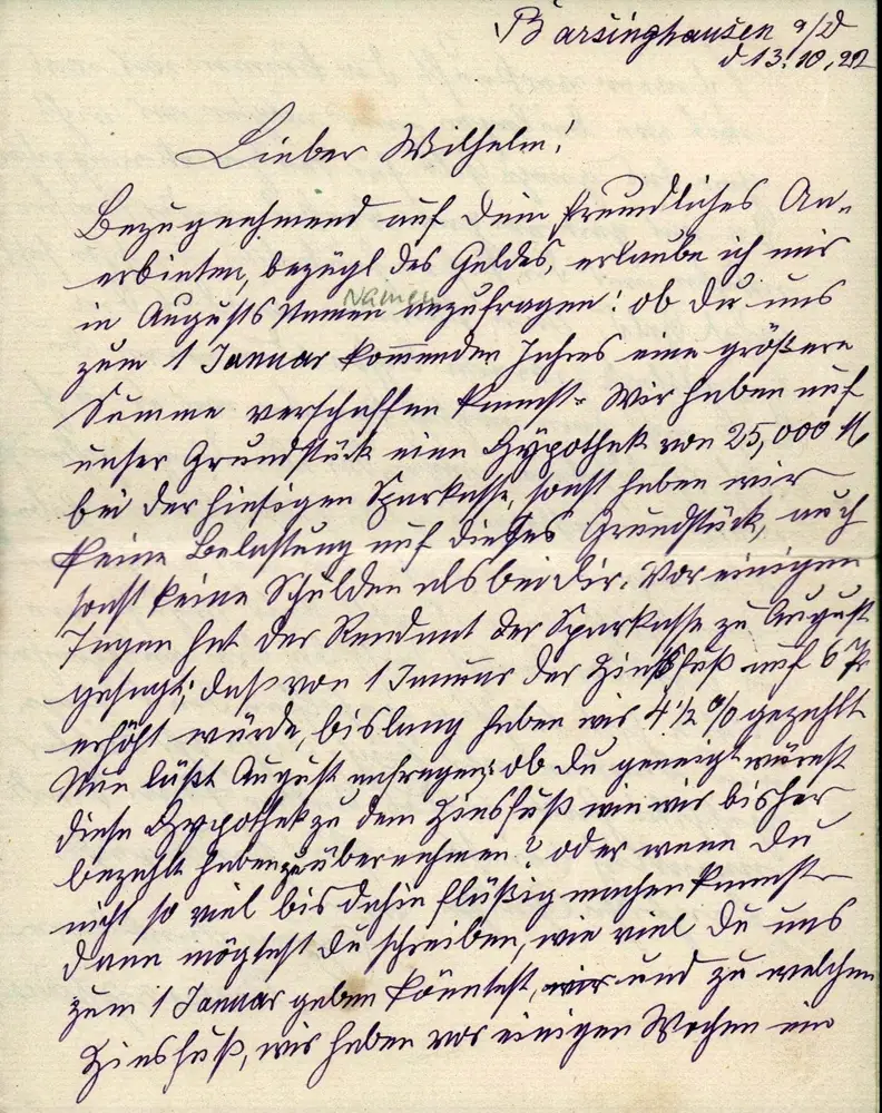 Handgeschriebener Brief an einen "Liebe(n) Wilhelm!". Datiert u. signiert (von "Euren dankbaren Barsinghäusern").