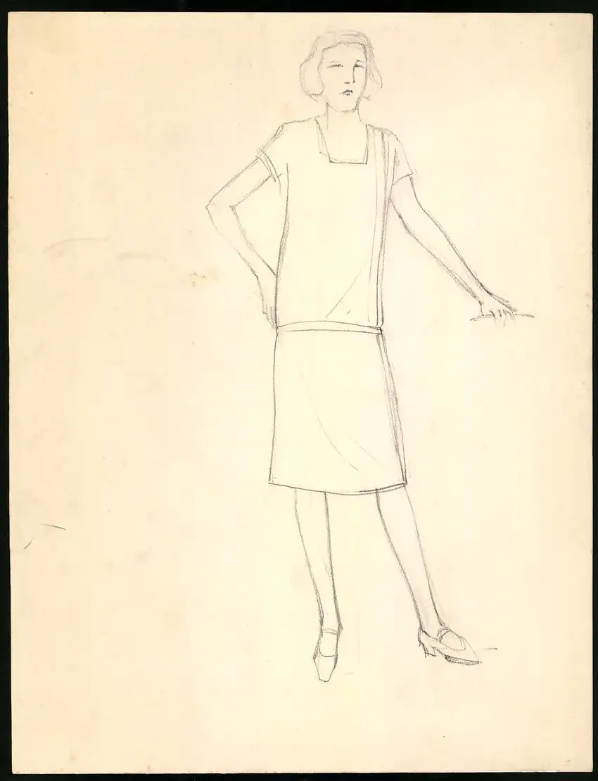 Handzeichnung Bleistiftzeichnung Mode, Frau im schlichten Kleid, 25 x 33cm
