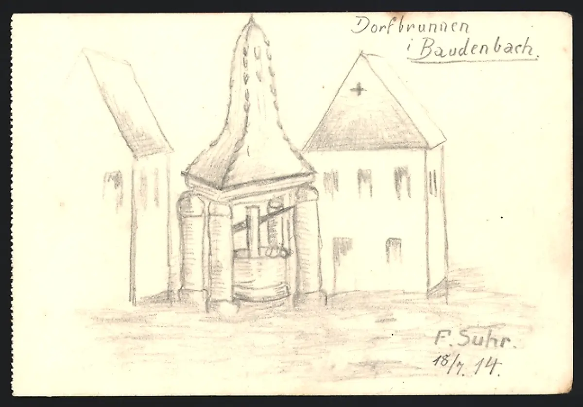 Handzeichnung F. Suhr, Baudenbach, der Dorfbrunnen, 1914