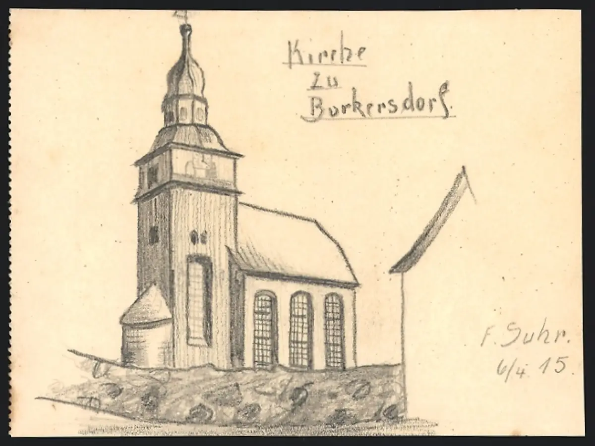 Handzeichnung F. Suhr, Burkersdorf b. Weida, die St. Elisabethkirche, 1915