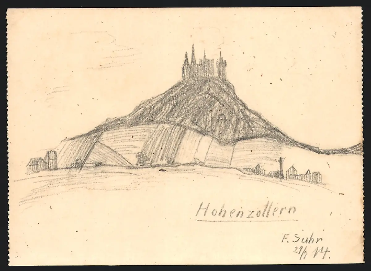 Handzeichnung F. Suhr, Hechingen, Blick nach der Burg Hohenzollern, 1914