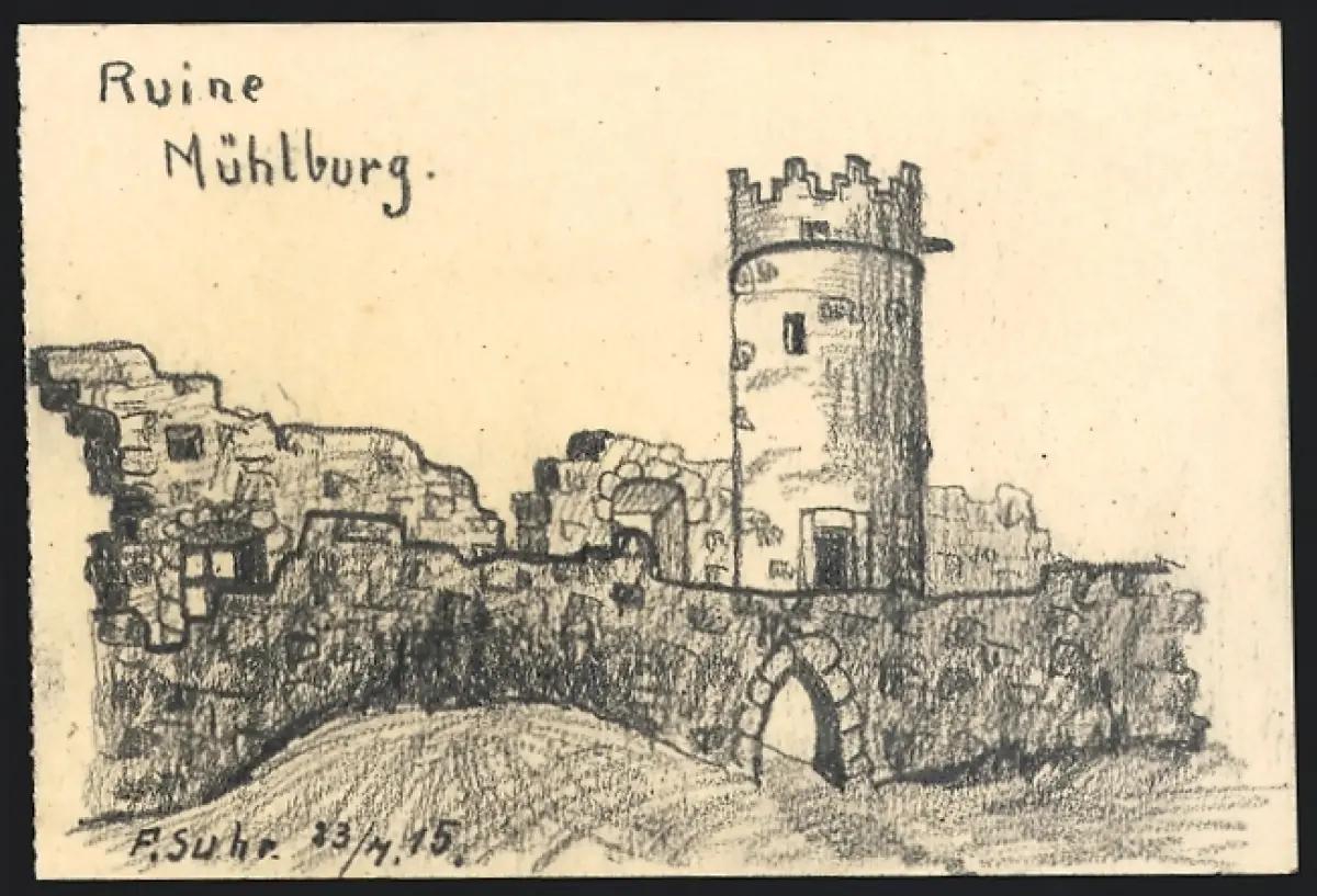 Handzeichnung F. Suhr, Mühlberg / Thüringen, Blick auf die Ruine Mühlberg, 1915
