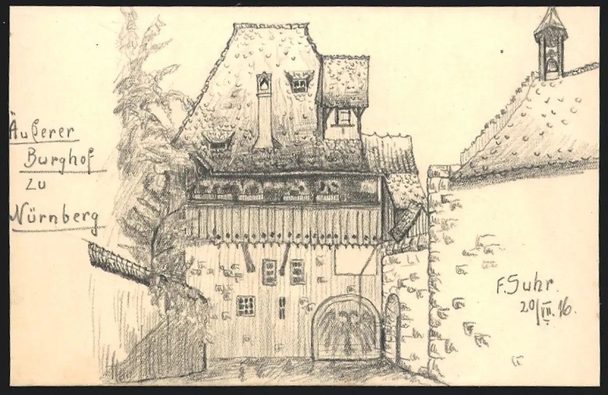Handzeichnung F. Suhr, Nürnberg, der äussere Burghof der Burg Nürnberg, 1916