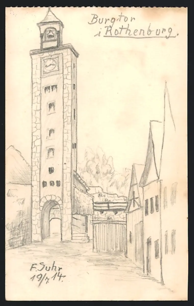 Handzeichnung F. Suhr, Rothenburg o. d. Tauber, Blick auf das Burgtor, 1914