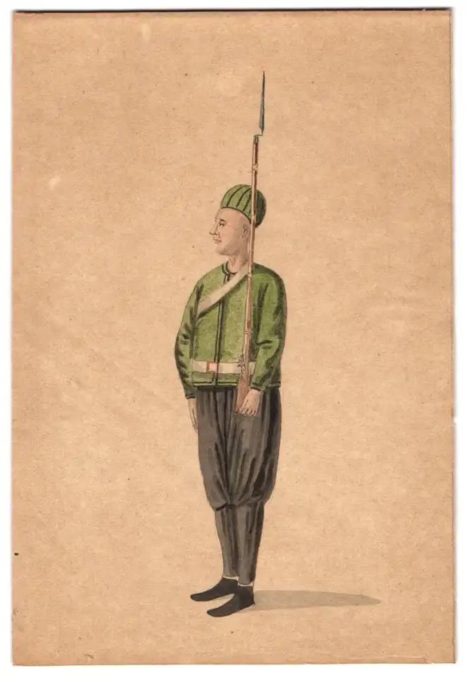 Handzeichnung Türkischer / Osmanischer Soldat in grüner Uniform mit geschultertem Gewehr